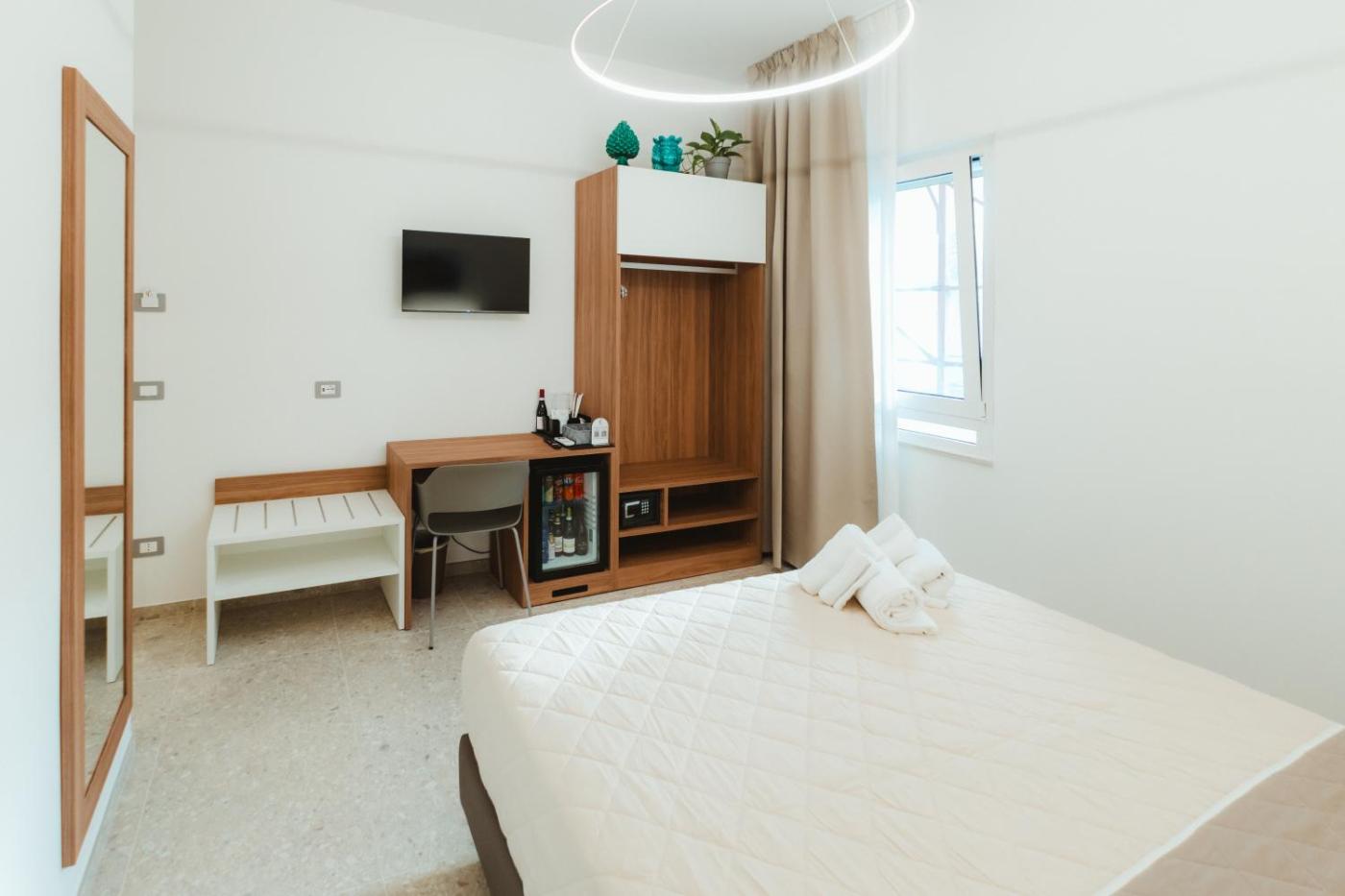 Camera King Standard. Camera matrimoniale climatizzata dotata di TV a schermo piatto con servizi di streaming, bagno privato e balcone con vista sulla città. L’alloggio dispone di 1 letto. ;