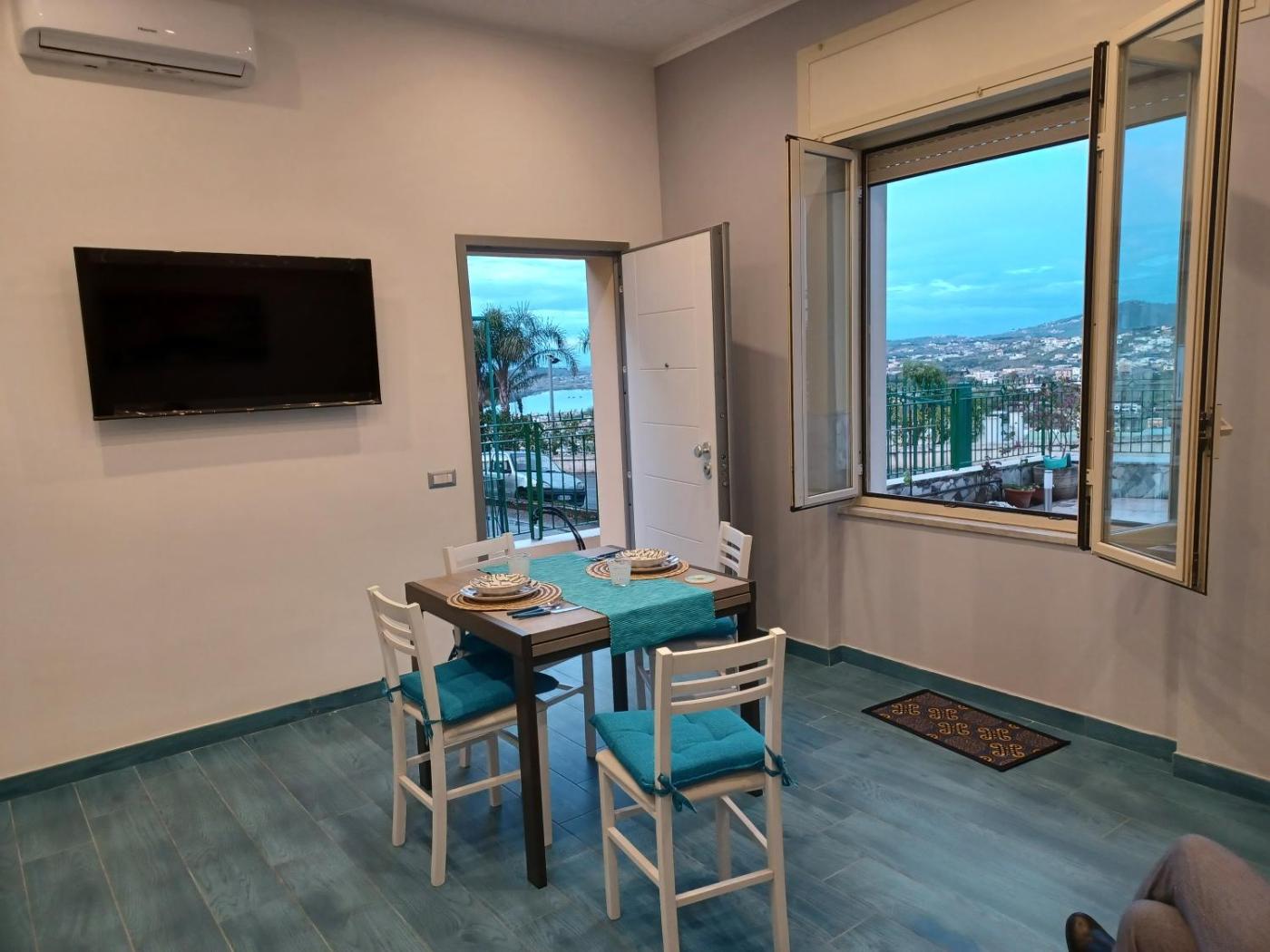 Appartamento con 1 Camera da Letto. Appartamento climatizzato con ingresso indipendente, 1 soggiorno, 1 camera da letto separata e 1 bagno con doccia e bidet. La cucina è ben attrezzata con piano cottura, frigorifero, utensili e forno. L’unità abitativa è dotata di terrazza con vista sul mare, lavatrice e TV a schermo piatto. L’alloggio presenta 2 letti.