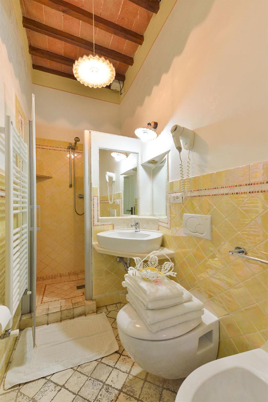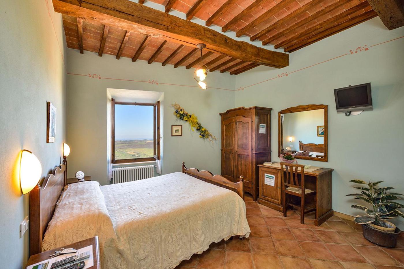 Camera Matrimoniale. Camera al 1° o 2° piano con WiFi gratuito, TV a schermo piatto, frigorifero e vista sulla campagna toscana e sulle strade del centro storico. Il bagno privato è munito di doccia. ;