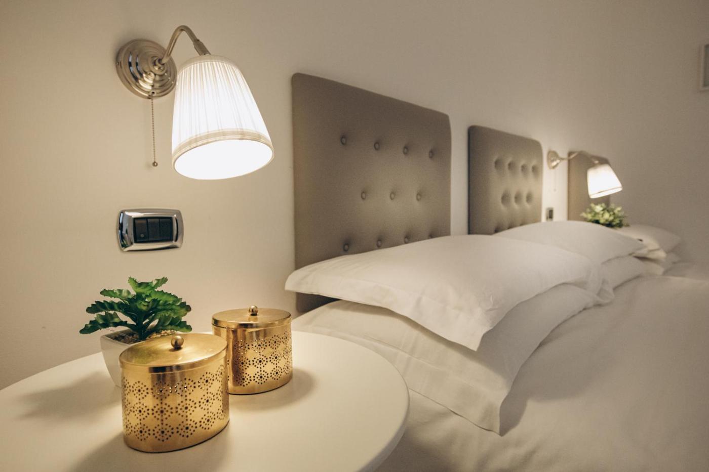 Camera Quadrupla. Camera quadrupla climatizzata con ingresso indipendente, balcone vista giardino e bagno privato munito di doccia. L’alloggio dispone di 3 letti.