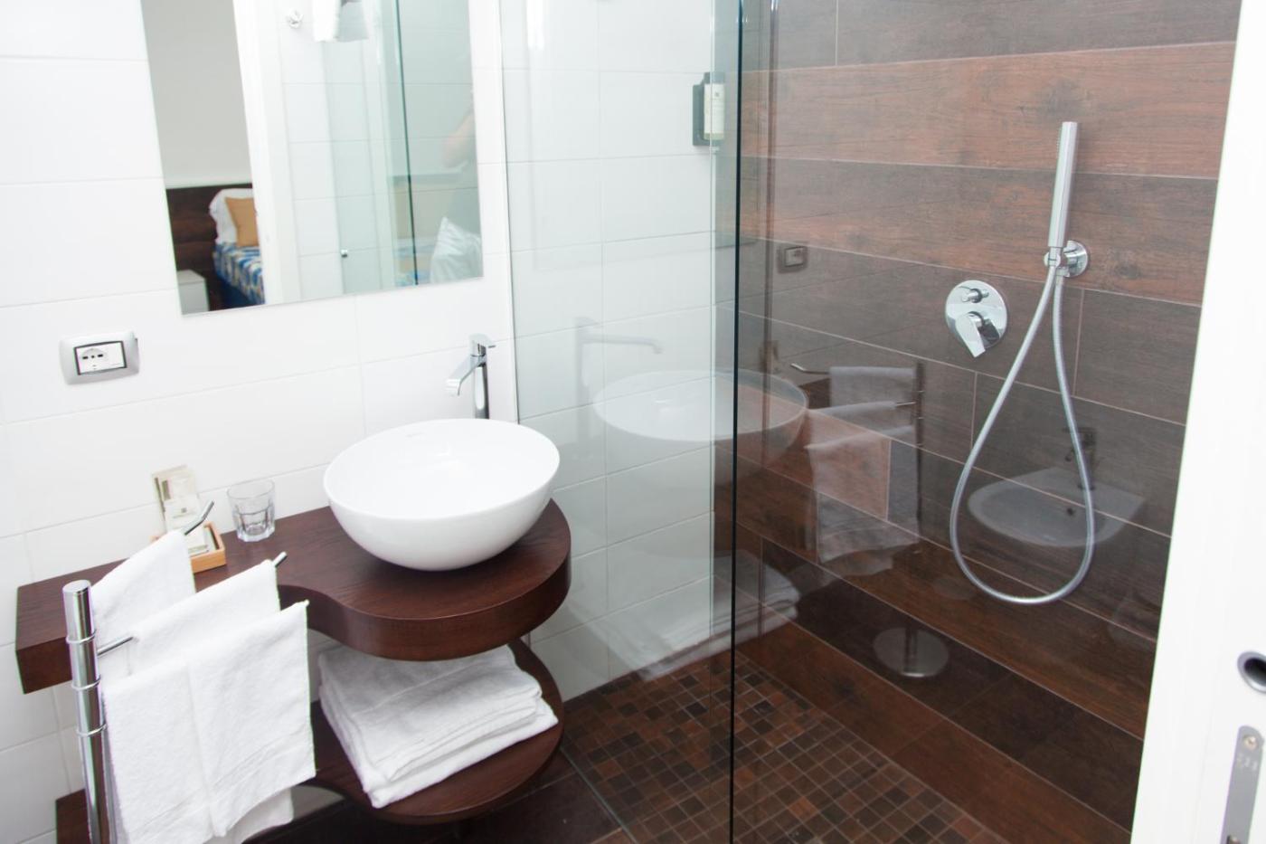 Camera Quadrupla. Providing free toiletries, this quadruple room includes a private bathroom with a walk-in shower, a bidet and a hairdryer. The air-conditioned quadruple room provides a flat-screen TV with streaming services, a private entrance, soundproof walls, a minibar as well as ancourtyard view. The unit offers 3 beds. ;